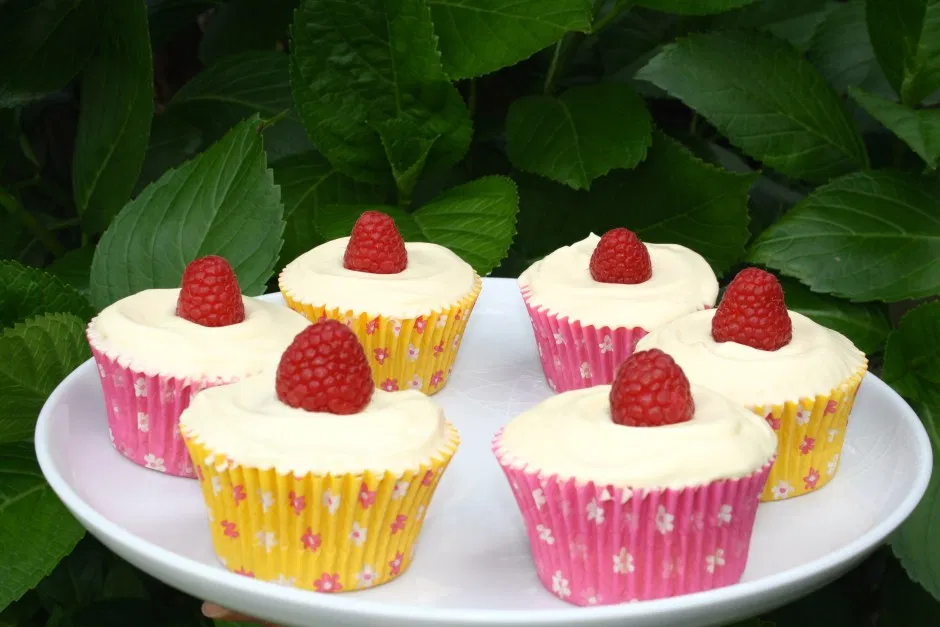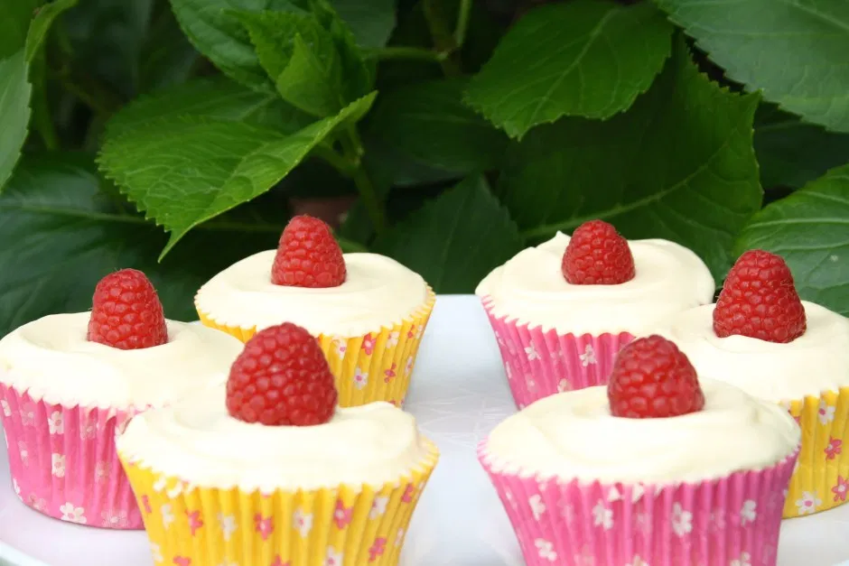 - Divide the mixture between the paper cases, filling each about half full. Place 2 raspberries on the surface of each – they will sink into the batter. Then fill each case almost to the top and place another fresh raspberry on top.