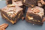 - Heat oven to 180C and line a 20 x 20cm brownie tin with baking parchment. Put the butter, dark chocolate and 50g of Terry’s chocolate orange in a non-stick saucepan and very gently melt over a low heat, stirring until smooth. Put to the side to cool slightly.